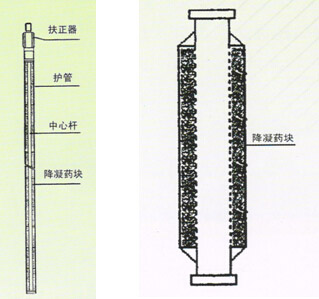 筒式防蠟器內裝有固體防蠟降凝劑,連接在抽油桿或油管上用于油井中防止結蠟。